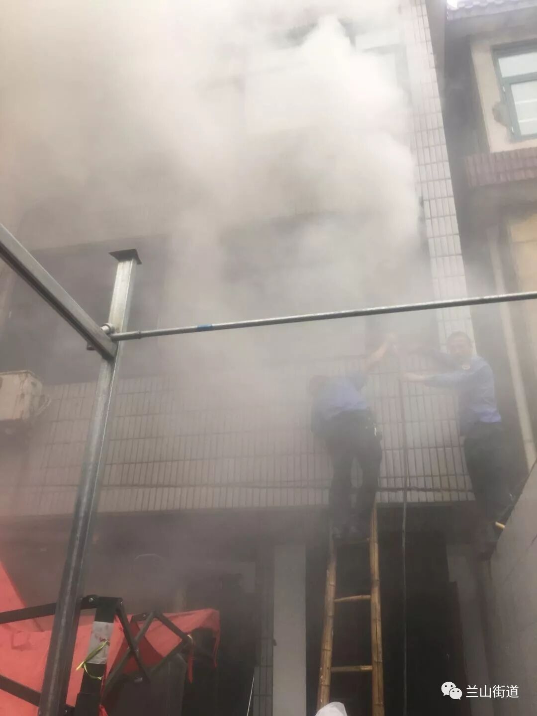 接到火灾信息后,崔立三、刘岩当即向沿街商铺借用了一辆电动三轮车及4个干粉灭火器,由于距离近,不到3分钟他们就赶到了失火现场,此时,李大造位于小区西排2楼的室内、室外已是浓烟滚滚,形势十分危急。崔立三、刘岩在第一时间疏散了周围的居民后,两人抱着灭火器重进室内,但由于火势凶猛,尽管用干了灭火器,也无济于事,还是被汹汹的浓烟给呛了出来。