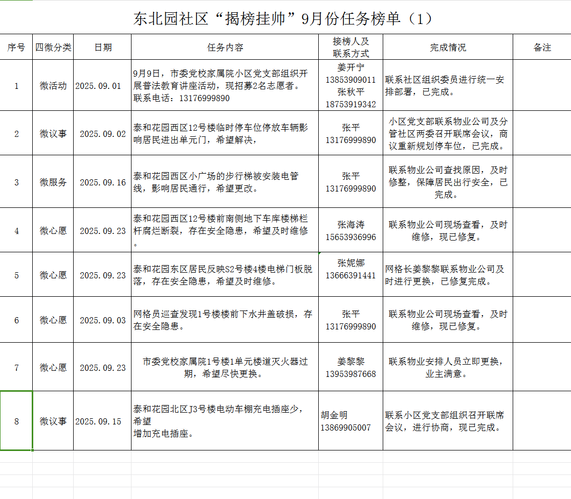东北园社区“揭榜挂帅”9月份任务榜单