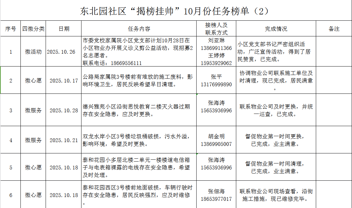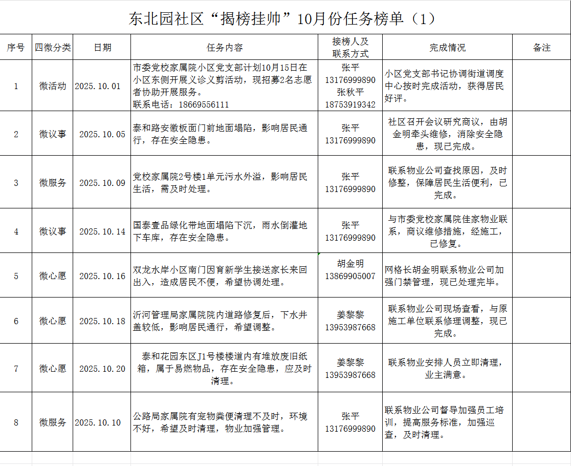 东北园社区“揭榜挂帅”10月份任务榜单