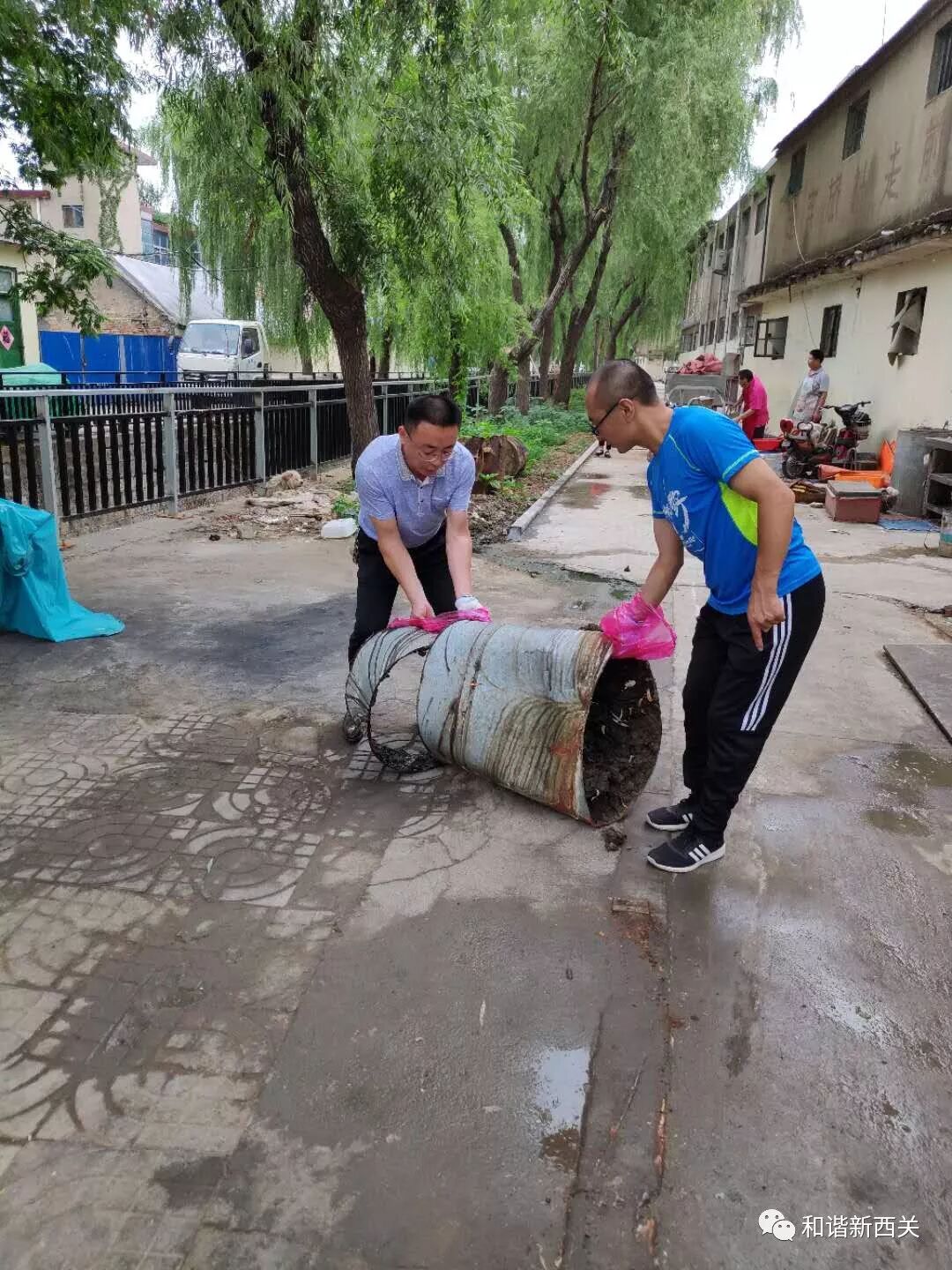 7月8日,社区党委书记郁新闻身穿红马夹,和社区班子成员、志愿者们一起,挥掀铲土、清理垃圾、排放车辆、帮助行动不便的老人料理生活。