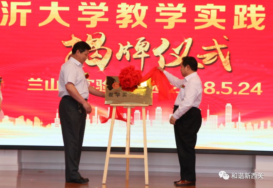 在热烈的掌声中,临沂大学费县分校党委书记孙成明、兰山区政府党组副书记、兰山商城管委会党委书记顾文明走上舞台中央,为临沂大学教学实践基地共同揭牌。