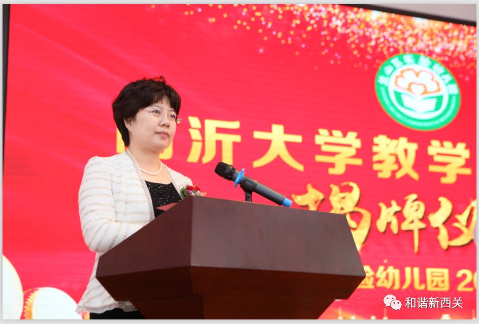 9点38分,揭牌仪式在幼儿园三楼小剧场举行。兰山区政府副区长王辉首先致辞,她代表区政府向各位领导各位嘉宾的到来表示热烈欢迎和衷心感谢。她说,兰山区(西关)实验幼儿园是一所建园时间早、办园质量好、社会美誉度高的幼儿园,先后获得省、市、区多项荣誉。她希望兰山区(西关)实验幼儿园在今后的工作中,继续发扬成绩,保持荣誉,特别是要借这次与临沂大学合作共建的契机,更好地搞好与临沂大学的配合和服务,为孩子们提供更加良好的教育,让孩子们在这里度过美好难忘的学习成长时光。