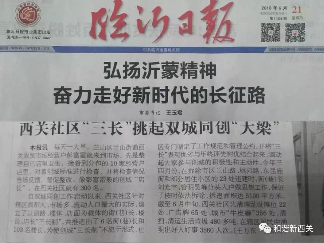 6月21日,临沂日报在《双城同创,共筑幸福美好家园》栏目中,报道了西关社区创城推行“三长制”的经验做法。