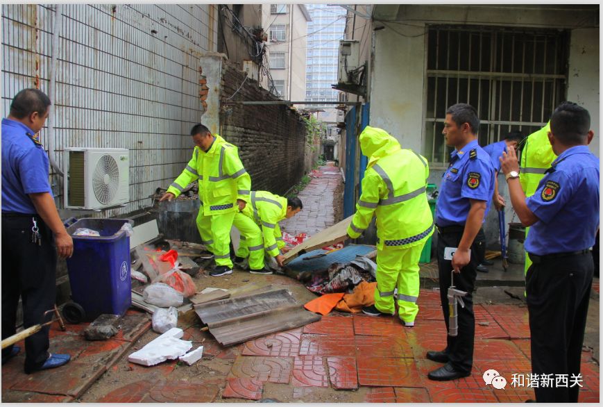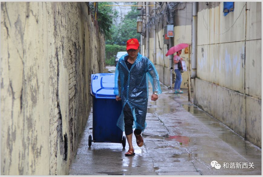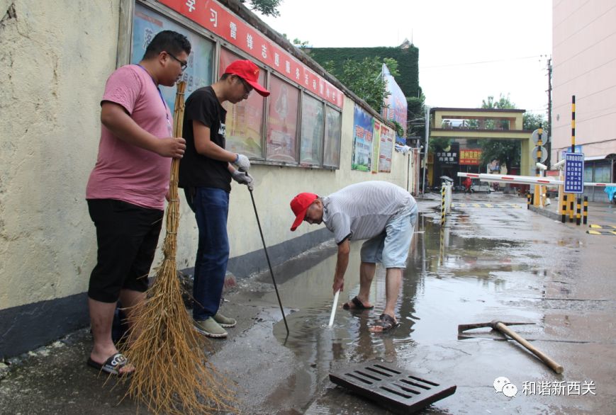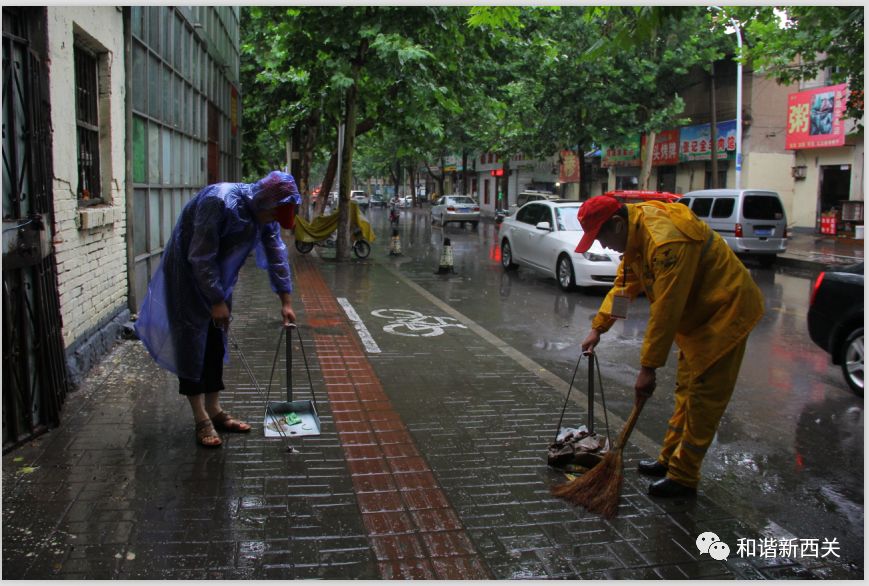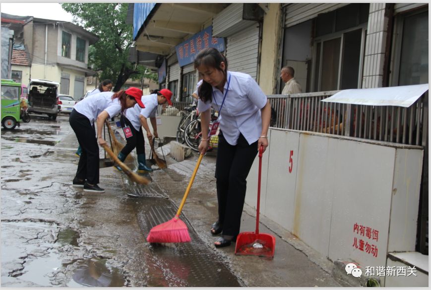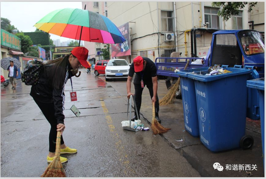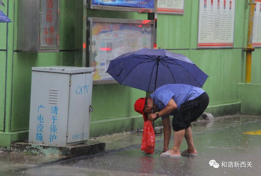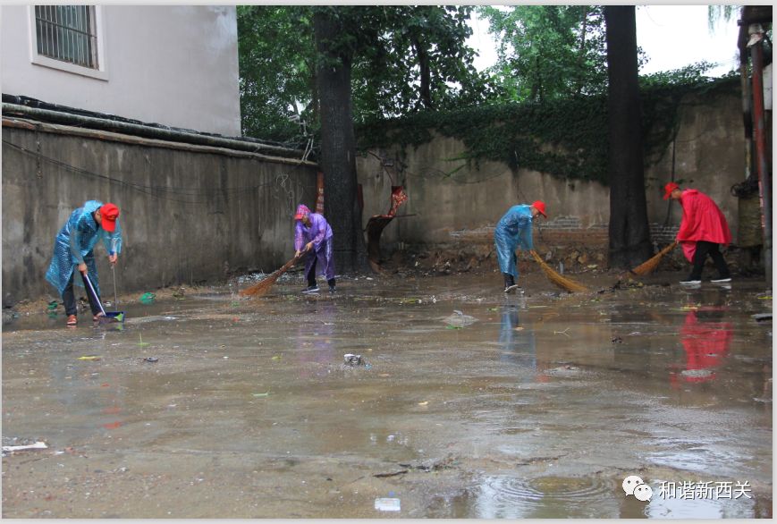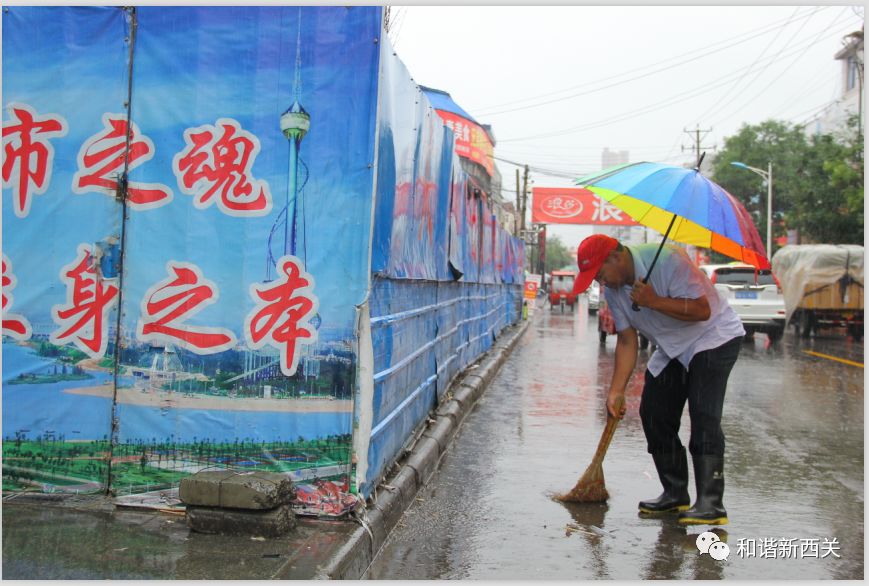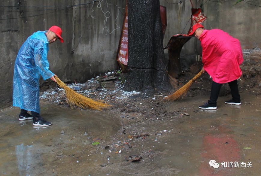 大雨不停,干劲不减。社区两委成员在社区党委书记郁新闻的带领下,冲在创城第一线,用模范行动带领大家创城。